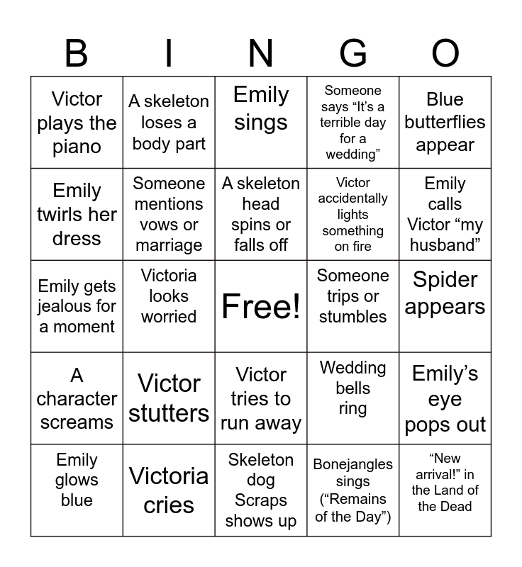 This bingo card has a free space and 24 words: Victor stutters, Victoria cries, A skeleton head spins or falls off, Emily glows blue, Blue butterflies appear, Victor plays the piano, Emily twirls her dress, A skeleton loses a body part, Someone trips or stumbles, Victor tries to run away, Victor accidentally lights something on fire, Emily gets jealous for a moment, Wedding bells ring, Emily’s eye pops out, Someone mentions vows or marriage, Bonejangles sings (“Remains of the Day”), Spider appears, Emily sings, Emily calls Victor “my husband”, Victoria looks worried, “New arrival!” in the Land of the Dead, A character screams, Someone says “It’s a terrible day for a wedding” and Skeleton dog Scraps shows up.