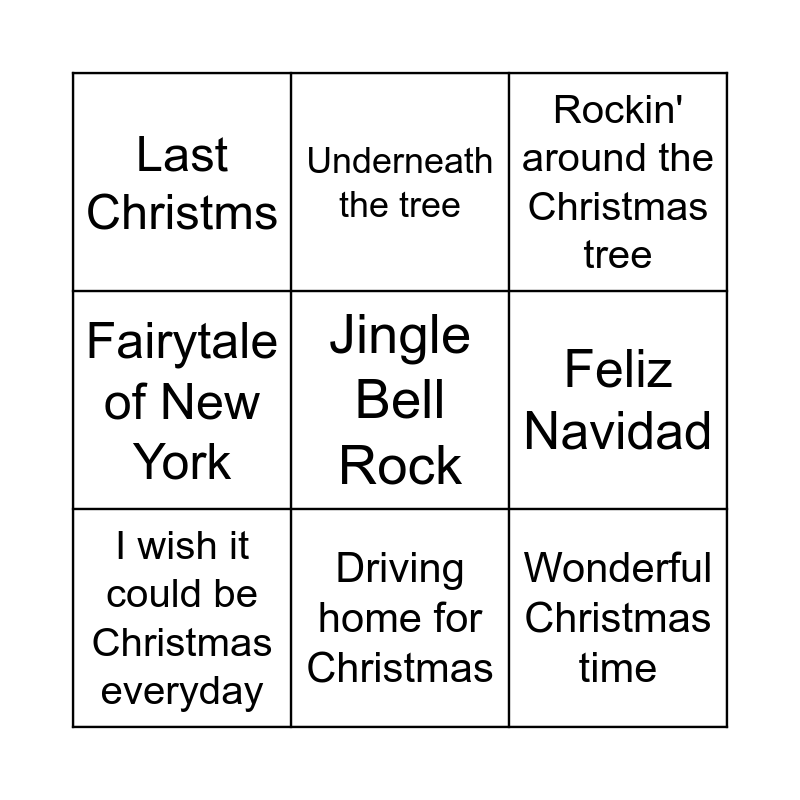 This bingo card has a free space and 17 words: It's beginning to look a lot like Christmas, All I want for Christmas is you, Rockin' around the Christmas tree, Last Christms, Holly Jolly Christmas, Fairytale of New York, It's the most wonderful time of the year, I wish it could be Christmas everyday, Driving home for Christmas, Feliz Navidad, Sleigh ride, White Christmas, Wonderful Christmas time, Underneath the tree, Santa Baby, Merry Christmas everyone and Santa tell me.