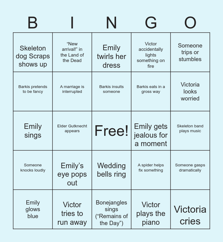 This bingo card has a free space and 45 words: Victor stutters, Victoria cries, A skeleton head spins or falls off, Emily glows blue, Blue butterflies appear, Victor plays the piano, Emily twirls her dress, A skeleton loses a body part, Someone trips or stumbles, Victor tries to run away, Victor accidentally lights something on fire, Emily gets jealous for a moment, Wedding bells ring, Emily’s eye pops out, Someone mentions vows or marriage, Bonejangles sings (“Remains of the Day”), Spider appears, Emily sings, Emily calls Victor “my husband”, Victoria looks worried, “New arrival!” in the Land of the Dead, A character screams, Someone says “It’s a terrible day for a wedding”, Skeleton dog Scraps shows up, Maggot pops out to talk, Skeleton band plays music, The dead break into song, Death-related pun (joke about dying), A spider helps fix something, Someone knocks loudly, Someone gets startled by a sudden noise, Someone gasps dramatically, Dramatic zoom-in shot, Someone mentions family or parents, Someone talks about the “other side”, Elder Gutknecht appears, Candle blows out, A door creaks open, Victoria sneaks out, Barkis insults someone, Barkis pretends to be fancy, Barkis eats in a gross way, A ring gets dropped, A marriage is interrupted and Someone faints.