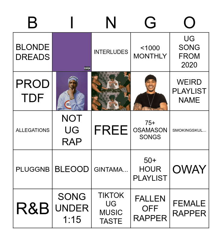 This bingo card has 4 images, a free space and 20 words: BLEOOD, SONG UNDER 1:15, R&B, UG SONG FROM 2020, BLONDE DREADS, PROD TDF, 75+ OSAMASON SONGS, GINTAMA..., ALLEGATIONS, 50+ HOUR PLAYLIST, OWAY, FALLEN OFF RAPPER, SMOKINGSKUL..., INTERLUDES, WEIRD PLAYLIST NAME, NOT UG RAP, FEMALE RAPPER, PLUGGNB, <1000 MONTHLY and TIKTOK UG MUSIC TASTE.