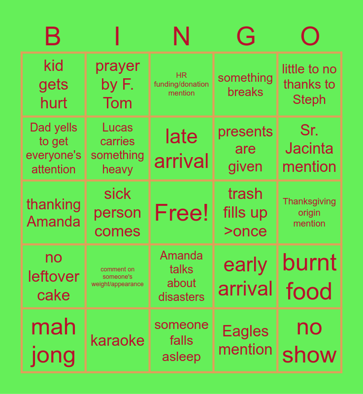 This bingo card has a free space and 24 words: comment on someone's weight/appearance, karaoke, late arrival, mah jong, little to no thanks to Steph, kid gets hurt, Dad yells to get everyone's attention, prayer by F. Tom, trash fills up >once, Amanda talks about disasters, presents are given, thanking Amanda, early arrival, burnt food, Lucas carries something heavy, Eagles mention, Thanksgiving origin mention, HR funding/donation mention, Sr. Jacinta mention, sick person comes, no show, no leftover cake, something breaks and someone falls asleep.