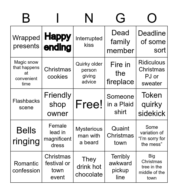 This bingo card has a free space and 24 words: Female lead in magnificent dress, Christmas festival or town event, Quirky older person giving advice, Romantic confession, Deadline of some sort, Wrapped presents, Magic snow that happens at convenient time, Happy ending, Someone in a Plaid shirt, Mysterious man with a beard, Fire in the fireplace, Flashbacks scene, Quaint Christmas town, Some variation of “I’m sorry for the mess”, Christmas cookies, Terribly awkward pickup line, Token quirky sidekick, Interrupted kiss, Ridiculous Christmas PJ or sweater, Friendly shop owner, Big Christmas tree in the middle of the town, Bells ringing, Dead family member and They drink hot chocolate.