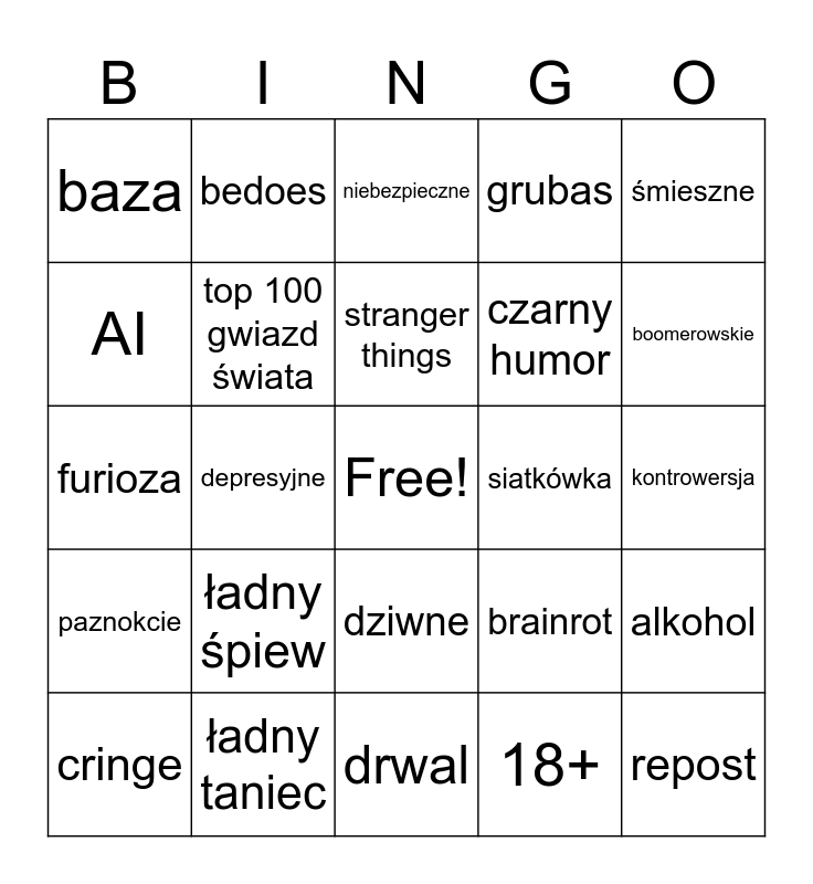 This bingo card has a free space and 24 words: ładny śpiew, ładny taniec, stranger things, cringe, śmieszne, baza, AI, bedoes, siatkówka, dziwne, czarny humor, furioza, brainrot, alkohol, top 100 gwiazd świata, 18+, kontrowersja, niebezpieczne, boomerowskie, depresyjne, repost, paznokcie, grubas and drwal.