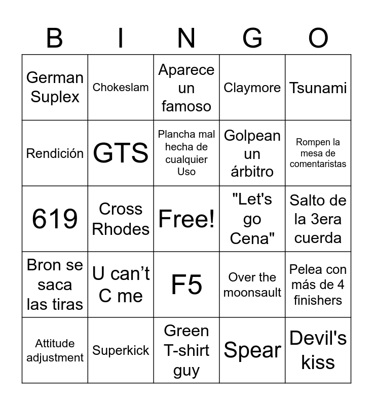 This bingo card has a free space and 39 words: "This is awesome", Alguien se mete en la pelea, Entrada épica, GTS, Attitude adjustment, F5, Plancha mal hecha de cualquier Uso, Botch, Tsunami, Bron se saca las tiras, Cross Rhodes, Claymore, Devil's kiss, Salto de la 3era cuerda, "Let's go Cena", U can’t C me, Kimura, German Suplex, Man Handle Slam, Over the moonsault, Rendición, Green T-shirt guy, Golpean un árbitro, Rompen la mesa de comentaristas, Blood, Chair, Rompen una valla, Suplex, Salto hacia afuera del ring, Chokeslam, Chops, Aparece un deportista, Aparece un famoso, Superkick, Spear, Campeón retiene, Pelea con más de 4 finishers, 619 and Riptide.