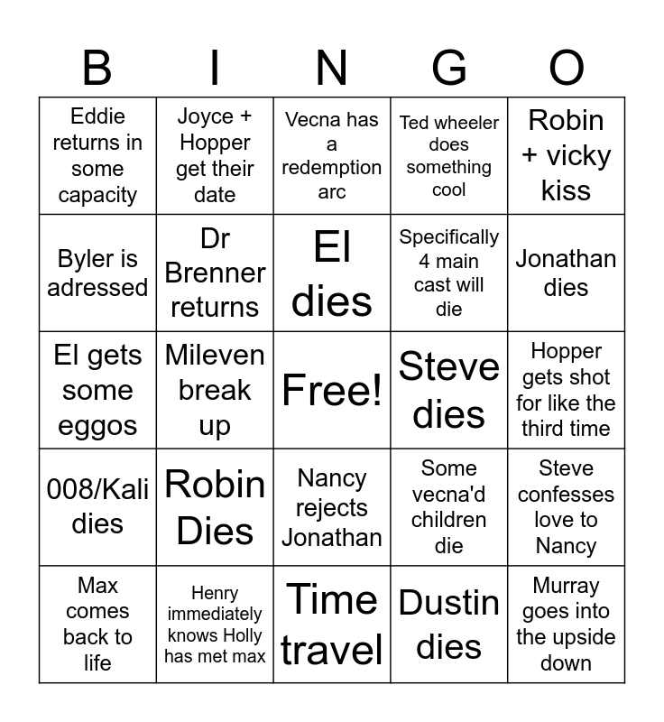 This bingo card has a free space and 24 words: Robin Dies, Henry immediately knows Holly has met max, El dies, Max comes back to life, Robin + vicky kiss, Eddie returns in some capacity, Byler is adressed, Joyce + Hopper get their date, Steve dies, Nancy rejects Jonathan, Specifically 4 main cast will die, El gets some eggos, Some vecna'd children die, Steve confesses love to Nancy, Dr Brenner returns, Dustin dies, Hopper gets shot for like the third time, Vecna has a redemption arc, Jonathan dies, Mileven break up, Murray goes into the upside down, 008/Kali dies, Ted wheeler does something cool and Time travel.