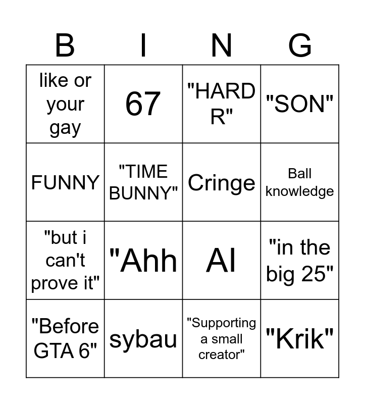 This bingo card has 16 words: sybau, "in the big 25", "HARD R", like or your gay, "but i can't prove it", 67, AI, "Supporting a small creator", FUNNY, "TIME BUNNY", "Before GTA 6", "SON", "Ahh, Ball knowledge, Cringe and "Krik".