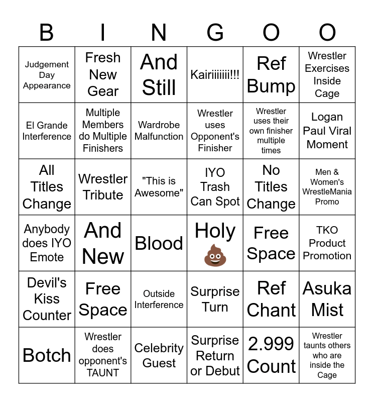 This bingo card has 36 words: Surprise Turn, Outside Interference, Surprise Return or Debut, El Grande Interference, Anybody does IYO Emote, IYO Trash Can Spot, Multiple Members do Multiple Finishers, Celebrity Guest, Ref Bump, Ref Chant, Logan Paul Viral Moment, Kairiiiiiii!!!, Asuka Mist, Wrestler Tribute, Wrestler uses Opponent's Finisher, Judgement Day Appearance, Devil's Kiss Counter, No Titles Change, All Titles Change, And Still, "This is Awesome", And New, Holy 💩, Blood, Free Space, Fresh New Gear, Wrestler uses their own finisher multiple times, Wrestler does opponent's TAUNT, Wardrobe Malfunction, Wrestler Exercises Inside Cage, Wrestler taunts others who are inside the Cage, Botch, TKO Product Promotion, Men & Women's WrestleMania Promo, Free Space and 2.999 Count.