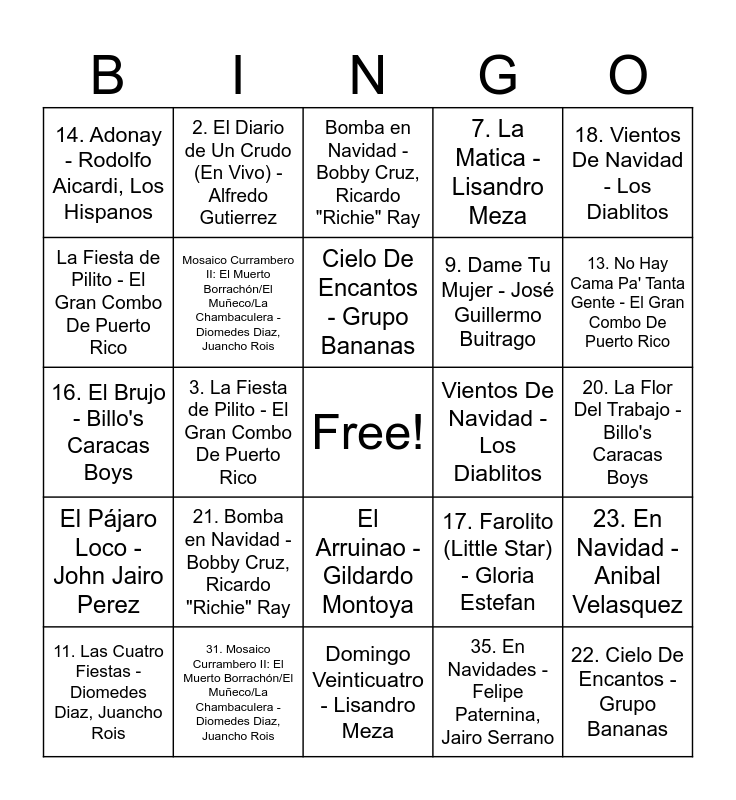 This bingo card has a free space and 72 words: 1. Los Sabanales - Los Corraleros De Majagual, Calixto Ochoa, 2. El Diario de Un Crudo (En Vivo) - Alfredo Gutierrez, 3. La Fiesta de Pilito - El Gran Combo De Puerto Rico, 4. Feliz Nochebuena - Rodolfo Aicardi, Los Hispanos, 5. El Arruinao - Gildardo Montoya, 6. El Hijo Ausente - Pastor Lopez, 7. La Matica - Lisandro Meza, 8. Se Va la Vida - Rodolfo Aicardi, 9. Dame Tu Mujer - José Guillermo Buitrago, 10. El Pájaro Loco - John Jairo Perez, 11. Las Cuatro Fiestas - Diomedes Diaz, Juancho Rois, 12. El Seis Chorreao - Richie Ray & Bobby Cruz, 13. No Hay Cama Pa' Tanta Gente - El Gran Combo De Puerto Rico, 14. Adonay - Rodolfo Aicardi, Los Hispanos, 15. Aguinaldo Con Billo - Billo's Caracas Boys, 16. El Brujo - Billo's Caracas Boys, 17. Farolito (Little Star) - Gloria Estefan, 18. Vientos De Navidad - Los Diablitos, 19. La Burrita - Los Corraleros De Majagual, Eliseo Herrera, 20. La Flor Del Trabajo - Billo's Caracas Boys, 21. Bomba en Navidad - Bobby Cruz, Ricardo "Richie" Ray, 22. Cielo De Encantos - Grupo Bananas, 23. En Navidad - Anibal Velasquez, 24. Alma Navideña - Fruko Y Sus Tesos, Joe Arroyo, 25. Navidad - Binomio de Oro, 26. El Niño Dios - Joe Arroyo, La Verdad, 27. Brisa de Diciembre - Rufo Garrido, Tony Zúñiga, 28. Domingo Veinticuatro - Lisandro Meza, 29. Mensaje De Navidad - Diomedes Diaz, Colacho Mendoza, 30. Las Cuatro Fiestas - Adolfo Echavarria con Nury Borras, 31. Mosaico Currambero II: El Muerto Borrachón/El Muñeco/La Chambaculera - Diomedes Diaz, Juancho Rois, 32. Lindo Diciembre - Jorge Oñate, Álvaro López, 33. Bendito Diciembre - Los Betos, 34. Hace un Mes - Los Corraleros De Majagual, Julio Erazo, 35. En Navidades - Felipe Paternina, Jairo Serrano, 36. Coupe cloue - Noel Compas, Los Sabanales - Los Corraleros De Majagual, Calixto Ochoa, El Diario de Un Crudo (En Vivo) - Alfredo Gutierrez, La Fiesta de Pilito - El Gran Combo De Puerto Rico, Feliz Nochebuena - Rodolfo Aicardi, Los Hispanos, El Arruinao - Gildardo Montoya, El Hijo Ausente - Pastor Lopez, La Matica - Lisandro Meza, Se Va la Vida - Rodolfo Aicardi, Dame Tu Mujer - José Guillermo Buitrago, El Pájaro Loco - John Jairo Perez, Las Cuatro Fiestas - Diomedes Diaz, Juancho Rois, El Seis Chorreao - Richie Ray & Bobby Cruz, No Hay Cama Pa' Tanta Gente - El Gran Combo De Puerto Rico, Adonay - Rodolfo Aicardi, Los Hispanos, Aguinaldo Con Billo - Billo's Caracas Boys, El Brujo - Billo's Caracas Boys, Farolito (Little Star) - Gloria Estefan, Vientos De Navidad - Los Diablitos, La Burrita - Los Corraleros De Majagual, Eliseo Herrera, La Flor Del Trabajo - Billo's Caracas Boys, Bomba en Navidad - Bobby Cruz, Ricardo "Richie" Ray, Cielo De Encantos - Grupo Bananas, En Navidad - Anibal Velasquez, Alma Navideña - Fruko Y Sus Tesos, Joe Arroyo, Navidad - Binomio de Oro, El Niño Dios - Joe Arroyo, La Verdad, Brisa de Diciembre - Rufo Garrido, Tony Zúñiga, Domingo Veinticuatro - Lisandro Meza, Mensaje De Navidad - Diomedes Diaz, Colacho Mendoza, Las Cuatro Fiestas - Adolfo Echavarria con Nury Borras, Mosaico Currambero II: El Muerto Borrachón/El Muñeco/La Chambaculera - Diomedes Diaz, Juancho Rois, Lindo Diciembre - Jorge Oñate, Álvaro López, Bendito Diciembre - Los Betos, Hace un Mes - Los Corraleros De Majagual, Julio Erazo, En Navidades - Felipe Paternina, Jairo Serrano and Coupe cloue - Noel Compas.