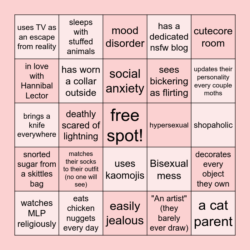 This bingo card has a free space and 24 words: matches their socks to their outfit (no one will see), eats chicken nuggets every day, social anxiety, watches MLP religiously, cutecore room, uses TV as an escape from reality, in love with Hannibal Lector, sleeps with stuffed animals, hypersexual, uses kaomojis, sees bickering as flirting, brings a knife everywhere, Bisexual mess, decorates every object they own, has worn a collar outside, "An artist" (they barely ever draw), shopaholic, mood disorder, updates their personality every couple moths, deathly scared of lightning, a cat parent, snorted sugar from a skittles bag, has a dedicated nsfw blog and easily jealous.