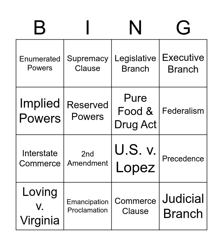 This bingo card has 26 words: Interstate Commerce, McCulloch v. Maryland, Federalism, Necessary & Proper Clause, Implied Powers, Enumerated Powers, Reserved Powers, Supremacy Clause, Commerce Clause, 10th Amendment, Interstate Commerce, U.S. v. Lopez, Gibbons v. Ogden, Sovereignty, Precedence, Extended Response, Executive Branch, Judicial Branch, Legislative Branch, Loving v. Virginia, 2nd Amendment, Civil War, Emancipation Proclamation, Pure Food & Drug Act, Pure Food & Drug Act and Anarchy.
