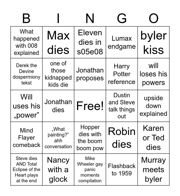 This bingo card has a free space and 24 words: „What painting?” ahh conversation, Nancy with a glock, Jonathan proposes, Steve dies AND Total Eclipse of the Heart plays at the end, byler kiss, What happened with 008 explained, Derek the Devine dospermiony tekst, Max dies, Dustin and Steve talk things out, Hopper dies with the boom boom pow, Harry Potter reference, Will uses his „power”, Robin dies, Karen or Ted dies, one of those kidnapped kids die, Flashback to 1959, upside down explained, Eleven dies in s05e08, will loses his powers, Jonathan dies, Murray meets byler, Mind Flayer comeback, Lumax endgame and Mike Wheeler gay panic moments compilation.