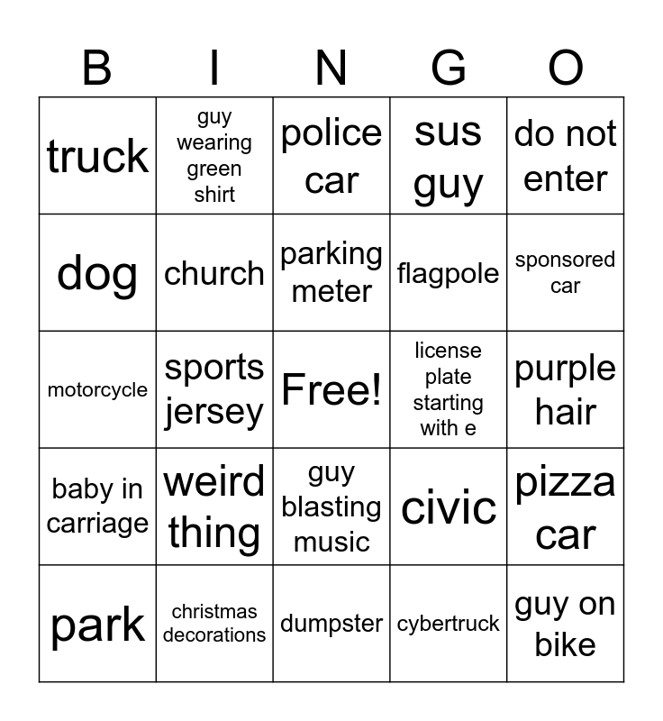 This bingo card has a free space and 24 words: weird thing, christmas decorations, parking meter, park, do not enter, truck, dog, guy wearing green shirt, license plate starting with e, guy blasting music, flagpole, motorcycle, civic, pizza car, church, cybertruck, purple hair, police car, sponsored car, sports jersey, guy on bike, baby in carriage, sus guy and dumpster.