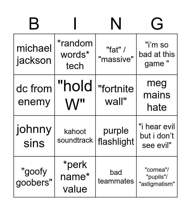This bingo card has 16 words: *perk name* value, "i hear evil but i don’t see evil", "fat" / "massive", michael jackson, johnny sins, *random words* tech, purple flashlight, bad teammates, dc from enemy, "hold W", "goofy goobers", "i’m so bad at this game ", kahoot soundtrack, meg mains hate, "fortnite wall" and "cornea"/ "pupils"/ "astigmatism".