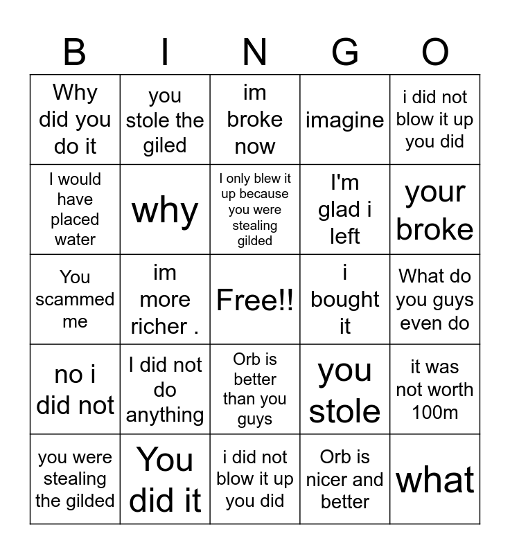 This bingo card has a free space and 24 words: I did not do anything, You did it, I only blew it up because you were stealing gilded, you were stealing the gilded, i did not blow it up you did, Why did you do it, I would have placed water, you stole the giled, i bought it, Orb is better than you guys, I'm glad i left, You scammed me, you stole, it was not worth 100m, why, Orb is nicer and better, What do you guys even do, im broke now, your broke, im more richer ., what, no i did not, imagine and i did not blow it up you did.
