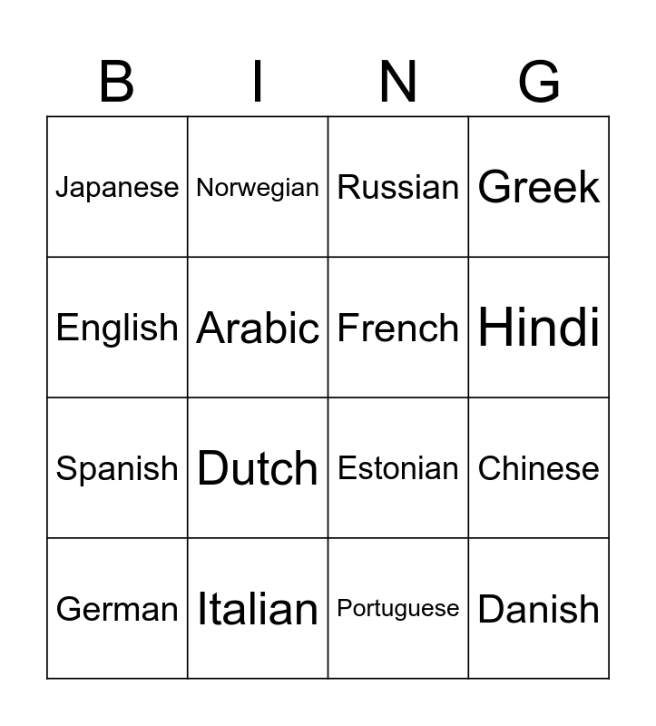 This bingo card has 16 words: Italian, Chinese, Russian, Japanese, Spanish, Norwegian, Estonian, Portuguese, English, Arabic, German, Greek, Dutch, Hindi, French and Danish.
