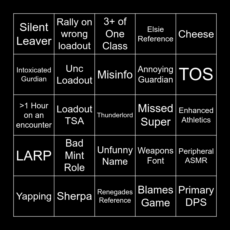 This bingo card has a free space and 24 words: Bad Mint Role, Sherpa, Misinfo, Yapping, Cheese, Silent Leaver, Intoxicated Gurdian, Rally on wrong loadout, Missed Super, Unfunny Name, Annoying Guardian, >1 Hour on an encounter, Weapons Font, Peripheral ASMR, Unc Loadout, Blames Game, Enhanced Athletics, 3+ of One Class, TOS, Loadout TSA, Primary DPS, LARP, Elsie Reference and Renegades Reference.
