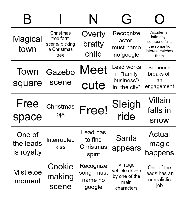 This bingo card has a free space and 24 words: Interrupted kiss, Cookie making scene, Meet cute, Mistletoe moment, Accidental intimacy - someone falls the romantic interest catches them, Magical town, Town square, Christmas tree farm scene/ picking a Christmas tree, Sleigh ride, Lead has to find Christmas spirit, Lead works in “family business”/ in “the city”, Free space, Santa appears, Actual magic happens, Gazebo scene, Vintage vehicle driven by one of the main characters, Villain falls in snow, Overly bratty child, Someone breaks off an engagement, Christmas pjs, One of the leads has an unrealistic job, One of the leads is royalty, Recognize actor- must name no google and Recognize song- must name no google.
