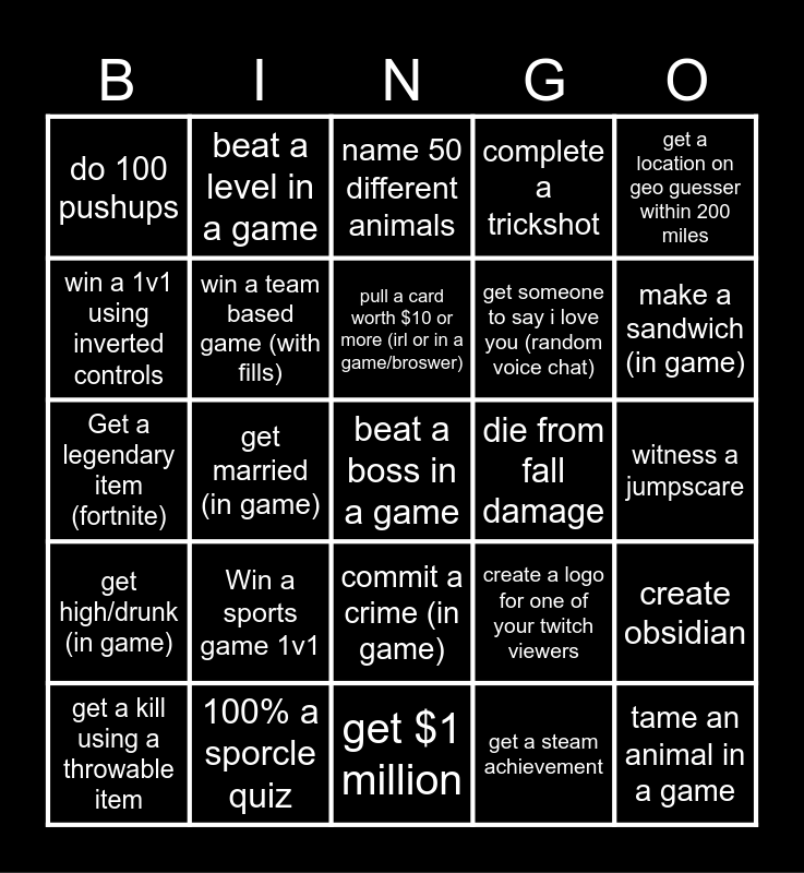 This bingo card has 25 words: Win a sports game 1v1, get $1 million, pull a card worth $10 or more (irl or in a game/broswer), get a kill using a throwable item, get a location on geo guesser within 200 miles, do 100 pushups, win a 1v1 using inverted controls, beat a level in a game, die from fall damage, commit a crime (in game), get someone to say i love you (random voice chat), Get a legendary item (fortnite), create a logo for one of your twitch viewers, create obsidian, win a team based game (with fills), tame an animal in a game, witness a jumpscare, name 50 different animals, make a sandwich (in game), get married (in game), beat a boss in a game, 100% a sporcle quiz, get high/drunk (in game), complete a trickshot and get a steam achievement.