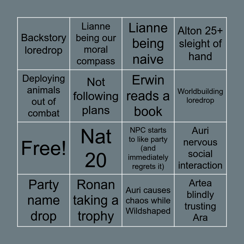 This bingo card has 56 words: Ronan almost starts a fight, Erwin Sending Services, Cat joke about Artea, Backstory loredrop, Alton healer kit, Ronan gets scolded, Erwin reads a book, Artea finds a use for paper, Free!, DM "One way to find out", Alton 25+ sleight of hand, Auri or Ronan fight over or for food, Auri makes a mean comment, Raiko giggling at innuendo / pun, Roll for initiative, Alton shady joke, Deploying animals out of combat, Auri nervous social interaction, Lianne wants to talk instead of fight, Party name drop, Ronan taking a trophy, Artea tentacles, Name spelled wrong, Lianne being naive, Cultist check, Worldbuilding loredrop, Erwin deception check, Nat 1, Nat 20, Someone threatens an NPC the party was trying to befriend, Artea casually drops dark lore mid conversation, Party got split, Plan goes wrong, Going in with no plan, Auri causes chaos while Wildshaped, Not following plans, NPC starts to like party (and immediately regrets it), Auri speaks with animals (and argues with them), Artea blindly trusting Ara, Lianne being our moral compass, Alton meets a horse, Artea flashes book, Crazy dice RNG, Ronan doesn't trust an NPC, Door boss, Potential crew member, Romantic moment wasted, DM "You can certainly try", Someone added cool flavor to an attack/spell, "oh no they're hot", Lianne party mom / oneesan moment, Someone suggesting crime, Someone from the party gets really drunk, Below 10 on a save you're (supposed to be) good at, Ronan orders breakfast ale/bacon and Big misunder-standing.