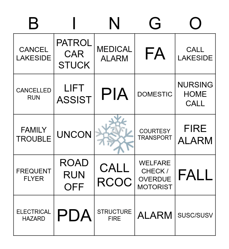 This bingo card has a free space and 24 words: ROAD RUN OFF, PDA, PIA, ELECTRICAL HAZARD, CALL LAKESIDE, CANCEL LAKESIDE, CANCELLED RUN, PATROL CAR STUCK, COURTESY TRANSPORT, CALL RCOC, DOMESTIC, FAMILY TROUBLE, WELFARE CHECK / OVERDUE MOTORIST, FALL, LIFT ASSIST, ALARM, FIRE ALARM, MEDICAL ALARM, NURSING HOME CALL, UNCON, SUSC/SUSV, FREQUENT FLYER, FA and STRUCTURE FIRE.