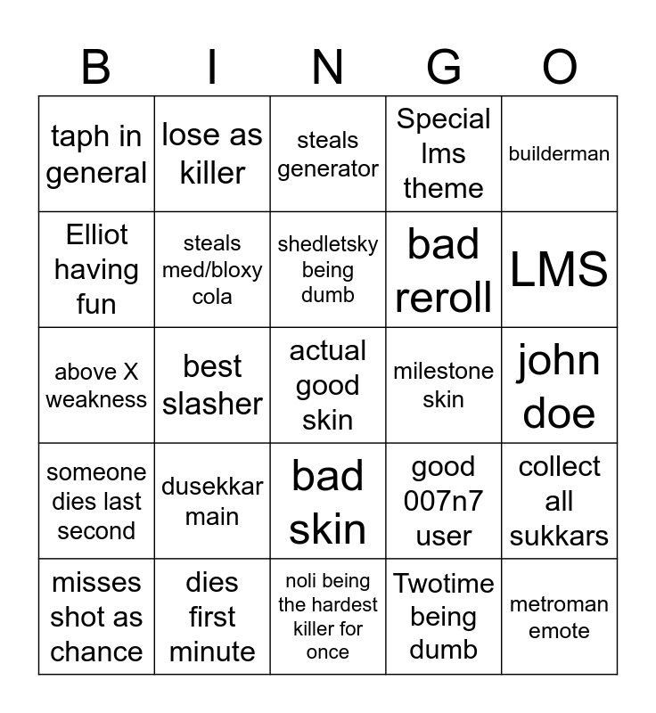This bingo card has a free space and 24 words: dusekkar main, dies first minute, shedletsky being dumb, misses shot as chance, builderman, taph in general, Elliot having fun, lose as killer, milestone skin, bad skin, bad reroll, above X weakness, good 007n7 user, collect all sukkars, steals med/bloxy cola, Twotime being dumb, john doe, steals generator, LMS, best slasher, metroman emote, someone dies last second, Special lms theme and noli being the hardest killer for once.