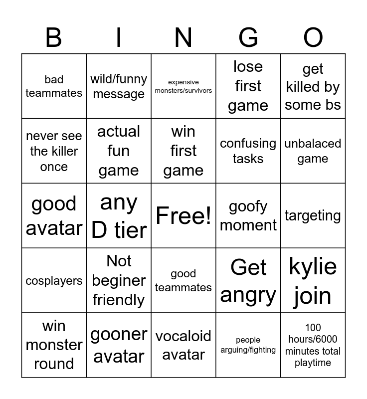 This bingo card has a free space and 24 words: Not beginer friendly, gooner avatar, win first game, win monster round, get killed by some bs, bad teammates, never see the killer once, wild/funny message, goofy moment, good teammates, confusing tasks, good avatar, Get angry, kylie join, actual fun game, people arguing/fighting, targeting, expensive monsters/survivors, unbalaced game, any D tier, 100 hours/6000 minutes total playtime, cosplayers, lose first game and vocaloid avatar.