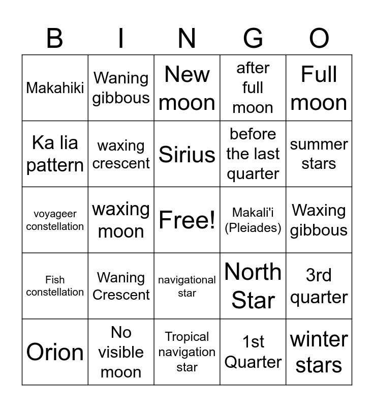 This bingo card has a free space and 24 words: Orion, Waning Crescent, Sirius, 1st Quarter, Full moon, Makahiki, Waning gibbous, New moon, Makali'i (Pleiades), Waxing gibbous, voyageer constellation, waxing crescent, North Star, 3rd quarter, Ka lia pattern, No visible moon, Tropical navigation star, after full moon, summer stars, Fish constellation, waxing moon, navigational star, before the last quarter and winter stars.
