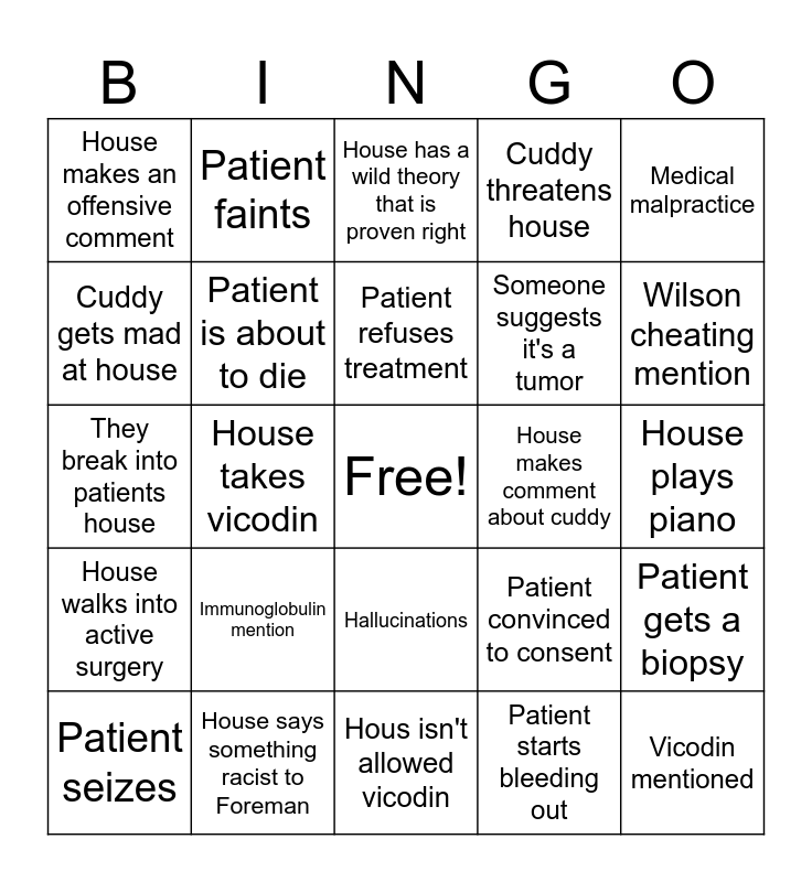 This bingo card has a free space and 29 words: Patient seizes, Patient has a tumor/cancer, House takes vicodin, Lupus mention, House makes an offensive comment, House has a wild theory that is proven right, Patient is about to die, Immunoglobulin mention, House makes comment about cuddy, House says something racist to Foreman, House plays piano, Vicodin mentioned, Hous isn't allowed vicodin, Patient starts bleeding out, Wilson cheating mention, House rude to patients family, Hallucinations, House walks into active surgery, Medical malpractice, They break into patients house, Patient convinced to consent, House does something without consent, Someone suggests it's a tumor, Cuddy gets mad at house, Cuddy threatens house, Patient faints, Patient gets a biopsy, Patient refuses treatment and House purposefully annoys Wilson.