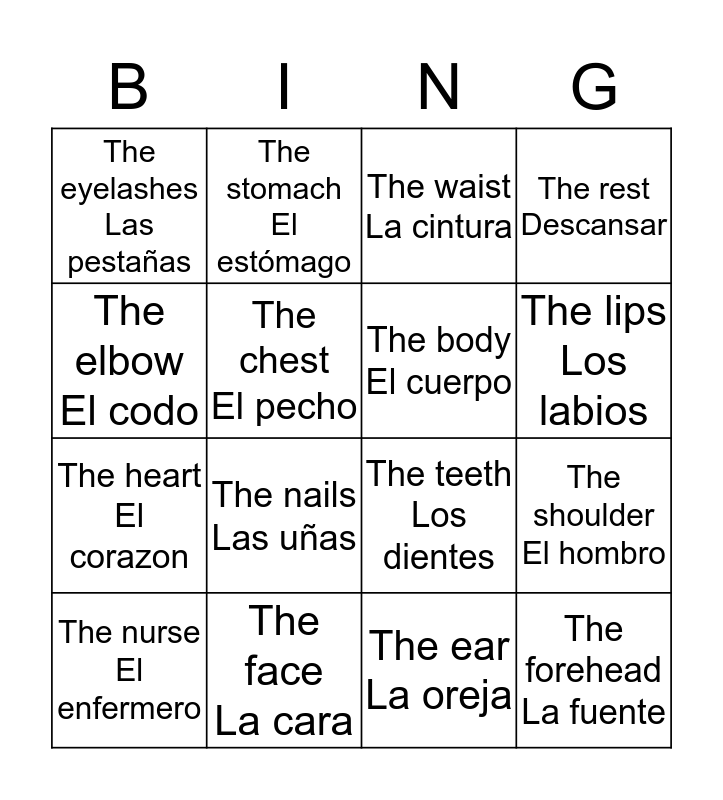 This bingo card has 16 words: The face La cara, The shoulder El hombro, The waist La cintura, The eyelashes Las pestañas, The heart El corazon, The stomach El estómago, The teeth Los dientes, The ear La oreja, The elbow El codo, The chest El pecho, The nurse El enfermero, The rest Descansar, The nails Las uñas, The lips Los labios, The body El cuerpo and The forehead La fuente.
