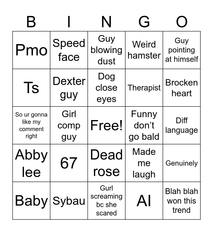This bingo card has a free space and 24 words: 67, Sybau, Dog close eyes, Baby, Guy pointing at himself, Pmo, Ts, Speed face, Funny don’t go bald, Dead rose, Therapist, So ur gonna like my comment right, Made me laugh, Genuinely, Dexter guy, AI, Diff language, Guy blowing dust, Brocken heart, Girl comp guy, Blah blah won this trend, Abby lee, Weird hamster and Gurl screaming bc she scared.