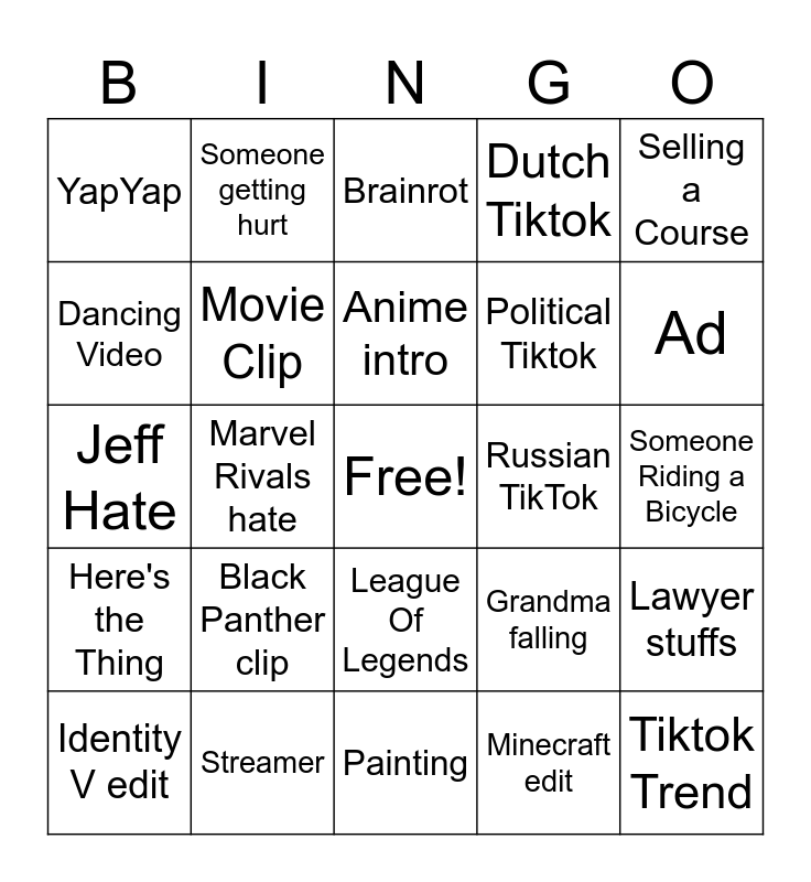 This bingo card has a free space and 25 words: Identity V edit, Black Panther clip, Anime intro, Minecraft edit, Ad, YapYap, Someone getting hurt, Brainrot, Political Tiktok, Lawyer stuffs, Jeff Hate, Movie Clip, Grandma falling, Tiktok Trend, Dancing Video, Streamer, Painting, Dutch Tiktok, Someone Riding a Bicycle, Here's the Thing, Marvel Rivals hate, League Of Legends, Russian TikTok, Selling a Course and Movie Clip.