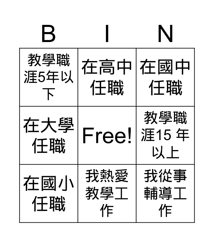 This bingo card has a free space and 9 words: 在國小任職, 在國中任職, 在高中任職, 在大學任職, 教學職涯5年以下, 教學職涯15 年以上, 我從事輔導工作, 我好想退休了 and 我熱愛教學工作.