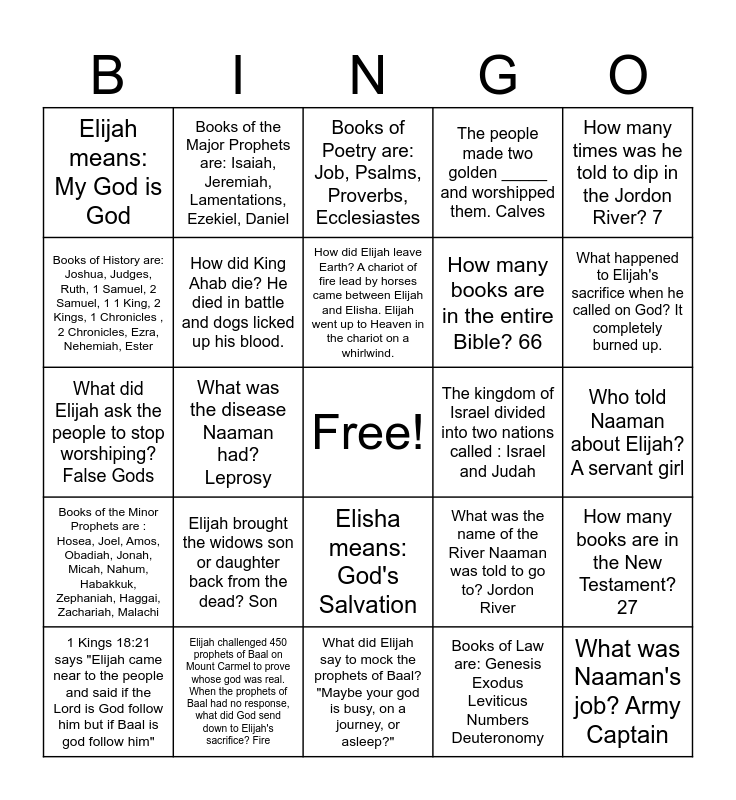 This bingo card has a free space and 28 words: How many books are in the New Testament? 27, How many books are in the Old Testament? 39, How many books are in the entire Bible? 66, Books of Law are: Genesis Exodus Leviticus Numbers Deuteronomy, Books of History are: Joshua, Judges, Ruth, 1 Samuel, 2 Samuel, 1 1 King, 2 Kings, 1 Chronicles , 2 Chronicles, Ezra, Nehemiah, Ester, Books of Poetry are: Job, Psalms, Proverbs, Ecclesiastes, Books of the Major Prophets are: Isaiah, Jeremiah, Lamentations, Ezekiel, Daniel, Books of the Minor Prophets are : Hosea, Joel, Amos, Obadiah, Jonah, Micah, Nahum, Habakkuk, Zephaniah, Haggai, Zachariah, Malachi, The kingdom of Israel divided into two nations called : Israel and Judah, 1 Kings 18:21 says "Elijah came near to the people and said if the Lord is God follow him but if Baal is god follow him", What did Elijah ask the people to stop worshiping? False Gods, The people made two golden _____ and worshipped them. Calves, Elijah challenged 450 prophets of Baal on Mount Carmel to prove whose god was real. When the prophets of Baal had no response, what did God send down to Elijah's sacrifice? Fire, What did Elijah say to mock the prophets of Baal? "Maybe your god is busy, on a journey, or asleep?", What happened to Elijah's sacrifice when he called on God? It completely burned up., Elijah made sure the Widow never ran out of what items? Oil and flour, Elijah brought the widows son or daughter back from the dead? Son, How did King Ahab die? He died in battle and dogs licked up his blood., How did Elijah leave Earth? A chariot of fire lead by horses came between Elijah and Elisha. Elijah went up to Heaven in the chariot on a whirlwind., Elisha means: God's Salvation, Elijah means: My God is God, What prophet came to lead after Elijah? Elisha, What was Naaman's job? Army Captain, What was the disease Naaman had? Leprosy, Who told Naaman about Elijah? A servant girl, What was the name of the River Naaman was told to go to? Jordon River, How many times was he told to dip in the Jordon River? 7 and When the stew was bad, what item did Elisha put in it to make it safe? Flour.