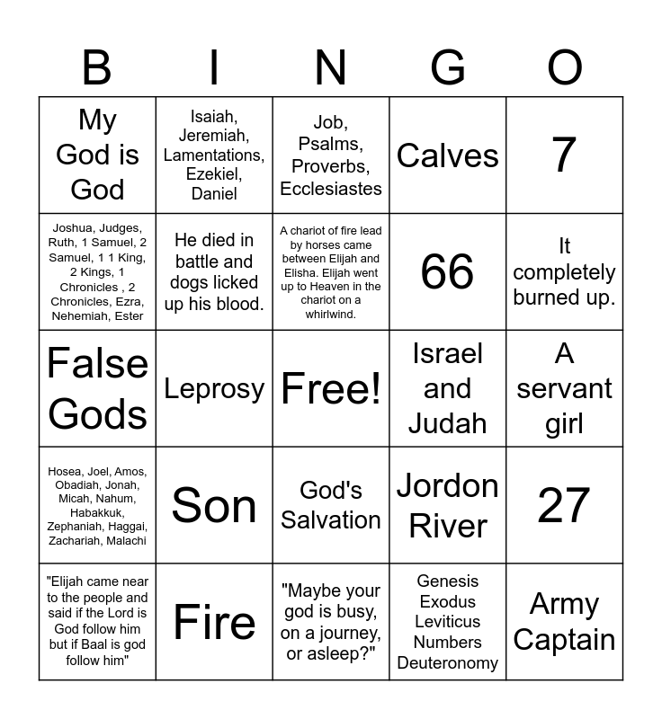 This bingo card has a free space and 28 words: 27, 39, 66, Genesis Exodus Leviticus Numbers Deuteronomy, Joshua, Judges, Ruth, 1 Samuel, 2 Samuel, 1 1 King, 2 Kings, 1 Chronicles , 2 Chronicles, Ezra, Nehemiah, Ester, Job, Psalms, Proverbs, Ecclesiastes, Isaiah, Jeremiah, Lamentations, Ezekiel, Daniel, Hosea, Joel, Amos, Obadiah, Jonah, Micah, Nahum, Habakkuk, Zephaniah, Haggai, Zachariah, Malachi, Israel and Judah, "Elijah came near to the people and said if the Lord is God follow him but if Baal is god follow him", False Gods, Calves, Fire, "Maybe your god is busy, on a journey, or asleep?", It completely burned up., Oil and flour, Son, He died in battle and dogs licked up his blood., A chariot of fire lead by horses came between Elijah and Elisha. Elijah went up to Heaven in the chariot on a whirlwind., God's Salvation, My God is God, Elisha, Army Captain, Leprosy, A servant girl, Jordon River, 7 and Flour.
