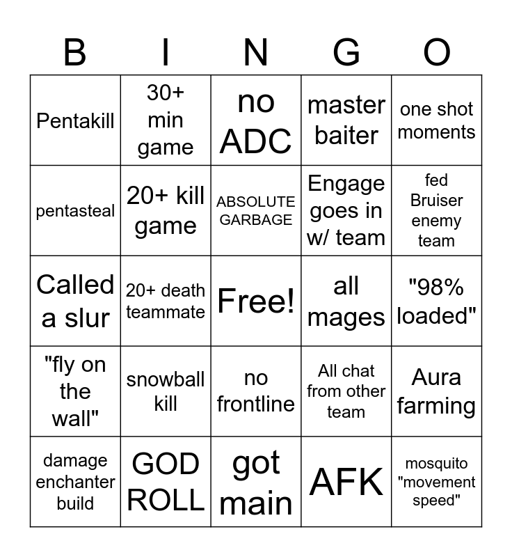 This bingo card has a free space and 24 words: snowball kill, GOD ROLL, ABSOLUTE GARBAGE, damage enchanter build, one shot moments, Pentakill, pentasteal, 30+ min game, all mages, no frontline, Engage goes in w/ team, Called a slur, All chat from other team, Aura farming, 20+ kill game, AFK, "98% loaded", no ADC, fed Bruiser enemy team, 20+ death teammate, mosquito "movement speed", "fly on the wall", master baiter and got main.