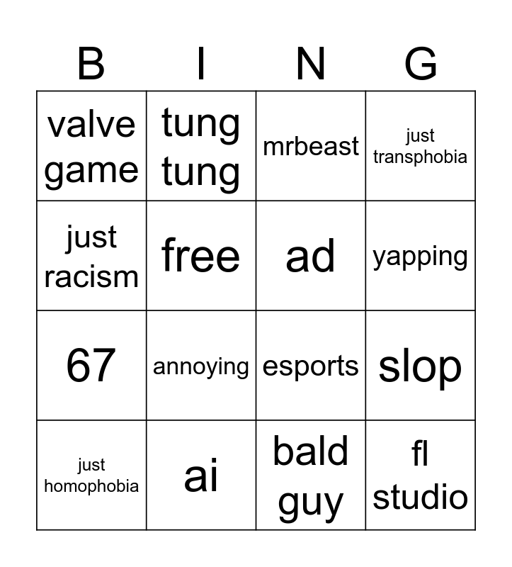 This bingo card has 16 words: ai, slop, mrbeast, valve game, 67, tung tung, esports, bald guy, just racism, free, just homophobia, just transphobia, annoying, yapping, ad and fl studio.