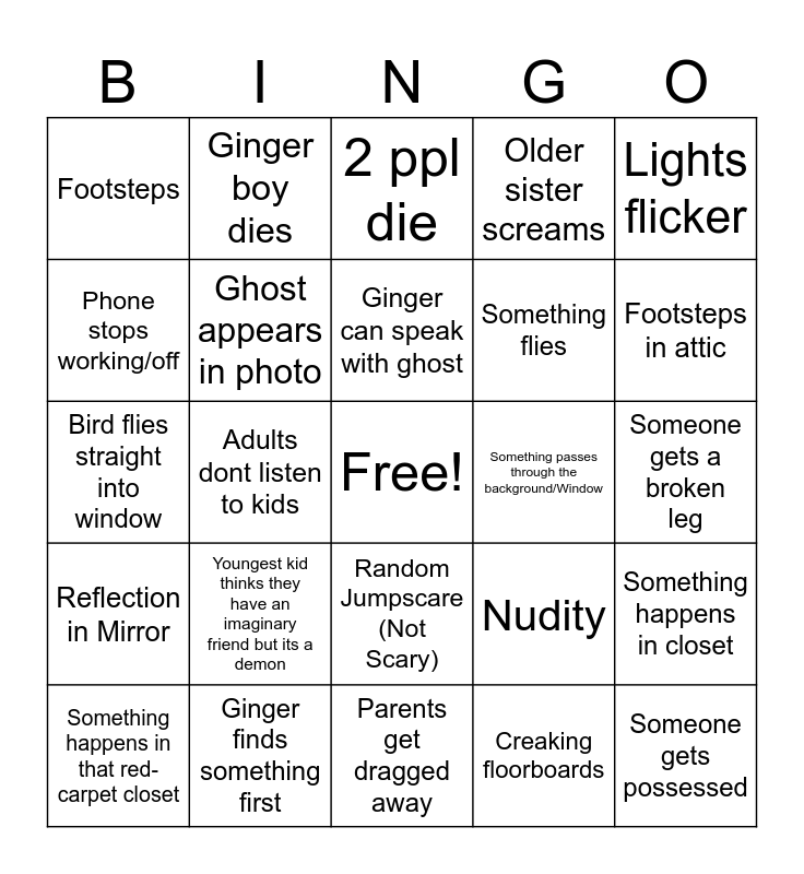 This bingo card has a free space and 24 words: Youngest kid thinks they have an imaginary friend but its a demon, Ginger finds something first, Ginger can speak with ghost, Something happens in that red-carpet closet, Lights flicker, Footsteps, Phone stops working/off, Ginger boy dies, Something passes through the background/Window, Random Jumpscare (Not Scary), Something flies, Bird flies straight into window, Nudity, Something happens in closet, Ghost appears in photo, Creaking floorboards, Someone gets a broken leg, 2 ppl die, Footsteps in attic, Adults dont listen to kids, Someone gets possessed, Reflection in Mirror, Older sister screams and Parents get dragged away.