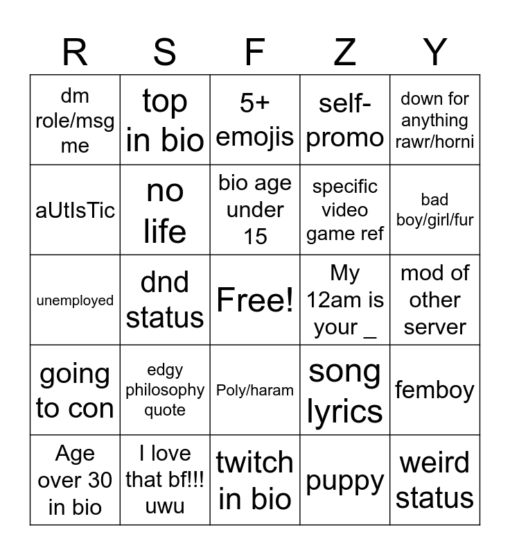This bingo card has a free space and 24 words: edgy philosophy quote, I love that bf!!! uwu, bio age under 15, Age over 30 in bio, down for anything rawr/horni, dm role/msg me, aUtIsTic, top in bio, My 12am is your _, Poly/haram, specific video game ref, unemployed, song lyrics, femboy, no life, puppy, mod of other server, 5+ emojis, bad boy/girl/fur, dnd status, weird status, going to con, self-promo and twitch in bio.
