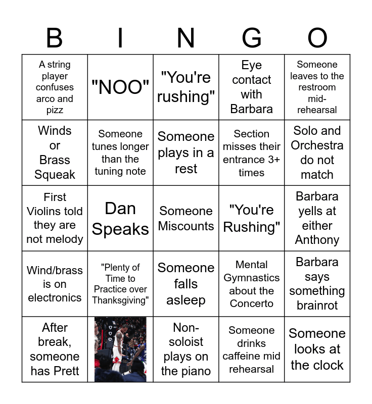 This bingo card has 1 images, a free space and 23 words: "Plenty of Time to Practice over Thanksgiving", Someone plays in a rest, After break, someone has Prett, Someone leaves to the restroom mid-rehearsal, A string player confuses arco and pizz, Winds or Brass Squeak, "NOO", "You're Rushing", Someone falls asleep, Section misses their entrance 3+ times, First Violins told they are not melody, Mental Gymnastics about the Concerto, Barbara says something brainrot, Someone tunes longer than the tuning note, Someone drinks caffeine mid rehearsal, Barbara yells at either Anthony, "You're rushing", Solo and Orchestra do not match, Dan Speaks, Someone looks at the clock, Wind/brass is on electronics, Eye contact with Barbara and Non-soloist plays on the piano.