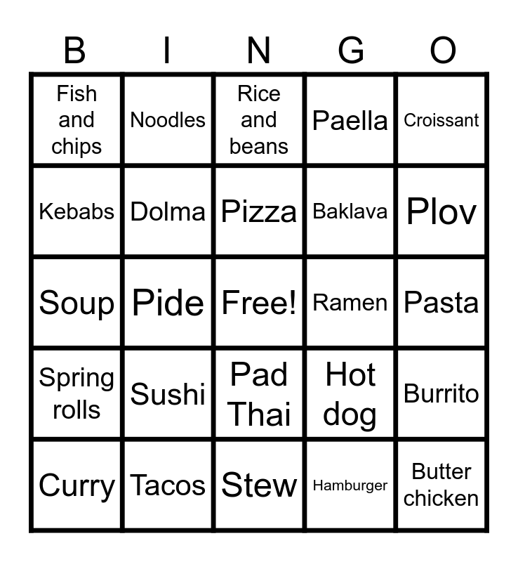 This bingo card has a free space and 24 words: Sushi, Tacos, Pizza, Curry, Croissant, Fish and chips, Kebabs, Noodles, Ramen, Pad Thai, Baklava, Soup, Hot dog, Burrito, Dolma, Hamburger, Pasta, Rice and beans, Plov, Pide, Butter chicken, Spring rolls, Paella and Stew.