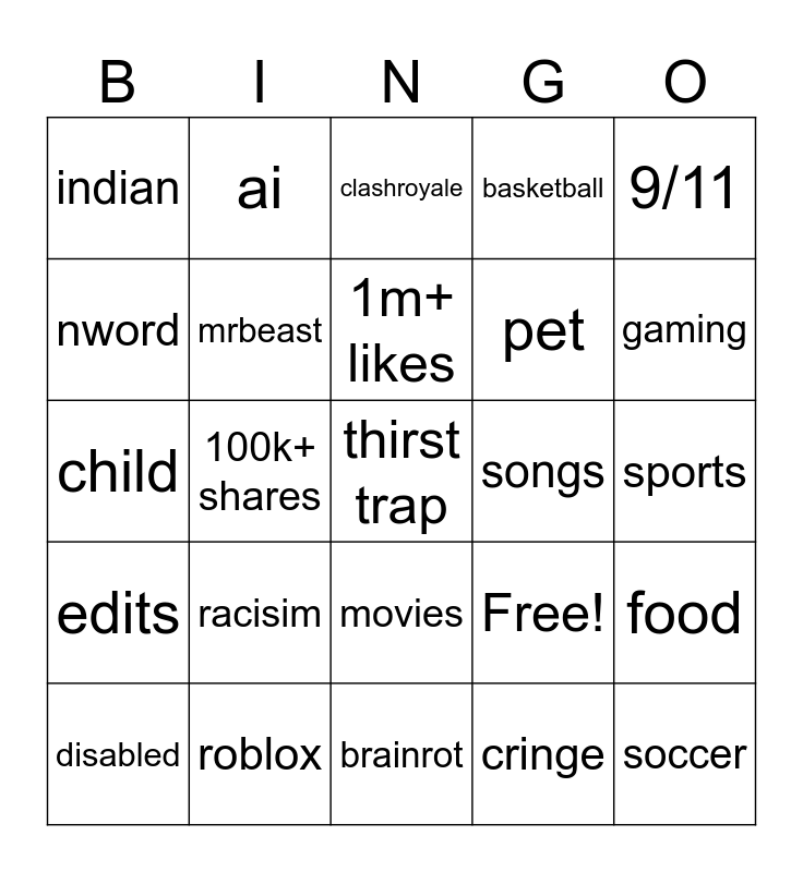 This bingo card has 25 words: racisim, brainrot, 1m+ likes, disabled, 9/11, indian, nword, ai, songs, movies, pet, child, Free!, food, mrbeast, soccer, sports, clashroyale, gaming, 100k+ shares, thirst trap, roblox, edits, basketball and cringe.