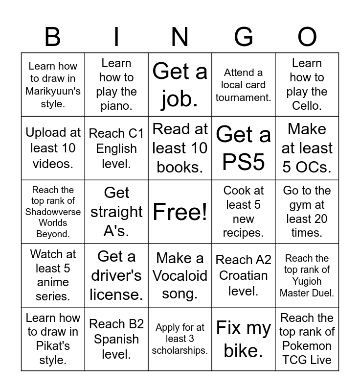 This bingo card has a free space and 24 words: Get a driver's license., Reach B2 Spanish level., Read at least 10 books., Learn how to draw in Pikat's style., Learn how to play the Cello., Learn how to draw in Marikyuun's style., Upload at least 10 videos., Learn how to play the piano., Cook at least 5 new recipes., Make a Vocaloid song., Get a PS5, Reach the top rank of Shadowverse Worlds Beyond., Reach A2 Croatian level., Reach the top rank of Yugioh Master Duel., Reach C1 English level., Fix my bike., Go to the gym at least 20 times., Get a job., Make at least 5 OCs., Get straight A's., Reach the top rank of Pokemon TCG Live, Watch at least 5 anime series., Attend a local card tournament. and Apply for at least 3 scholarships..