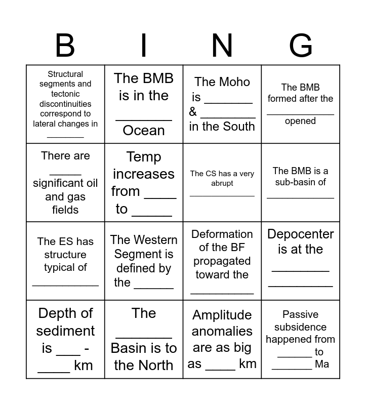 This bingo card has 20 words: Depocenter is at the ________ _________, How many tectonic regimes are there?, The Moho is _______ & ________ in the South, What direction is the depocenter shifting?, Depth of sediment is ___ - ____ km, There are _____ significant oil and gas fields, The _______ Basin is to the North, Structural segments and tectonic discontinuities correspond to lateral changes in ________, The ES has structure typical of ___________, The BMB is in the _______ Ocean, The Western Segment is defined by the ______, Deformation of the BF propagated toward the __________, Temp increases from ____ to _____, Passive subsidence happened from ______ to _______ Ma, The CS has a very abrupt _______________, Deformation in the BF is associated with tectonic ____________, The BMB is a sub-basin of _____________, The BMB formed after the _____________ opened, Amplitude anomalies are as big as ____ km and Crustal thinning is happening in the _______ segment.