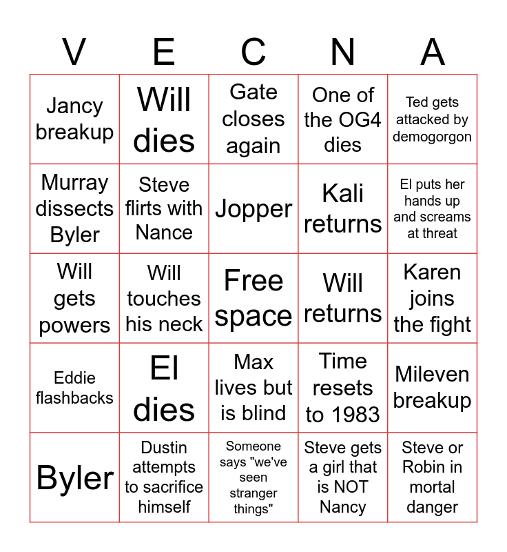 This bingo card has a free space and 24 words: El dies, Dustin attempts to sacrifice himself, Jopper, Byler, Ted gets attacked by demogorgon, Jancy breakup, Murray dissects Byler, Will dies, Will returns, Max lives but is blind, Kali returns, Will gets powers, Time resets to 1983, Mileven breakup, Steve flirts with Nance, Steve gets a girl that is NOT Nancy, Karen joins the fight, Gate closes again, El puts her hands up and screams at threat, Will touches his neck, Steve or Robin in mortal danger, Eddie flashbacks, One of the OG4 dies and Someone says "we've seen stranger things".