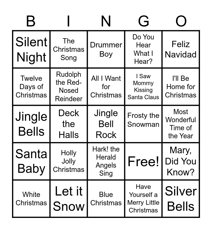 This bingo card has 25 words: Holly Jolly Christmas, Blue Christmas, All I Want for Christmas, White Christmas, Feliz Navidad, Silent Night, Twelve Days of Christmas, The Christmas Song, Frosty the Snowman, Hark! the Herald Angels Sing, I Saw Mommy Kissing Santa Claus, Jingle Bells, Free!, Mary, Did You Know?, Rudolph the Red-Nosed Reindeer, Silver Bells, Most Wonderful Time of the Year, Drummer Boy, I'll Be Home for Christmas, Deck the Halls, Jingle Bell Rock, Let it Snow, Santa Baby, Do You Hear What I Hear? and Have Yourself a Merry Little Christmas.