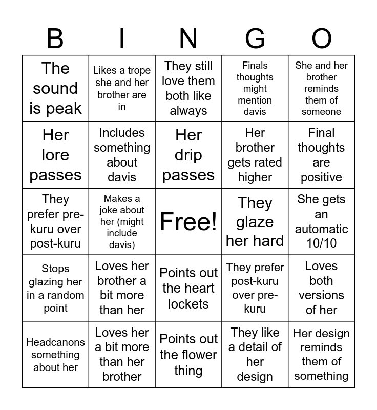This bingo card has a free space and 24 words: Loves her brother a bit more than her, Loves her a bit more than her brother, Her drip passes, Headcanons something about her, She and her brother reminds them of someone, The sound is peak, Her lore passes, Likes a trope she and her brother are in, They glaze her hard, Points out the heart lockets, Her brother gets rated higher, They prefer pre-kuru over post-kuru, They prefer post-kuru over pre-kuru, Loves both versions of her, Includes something about davis, They like a detail of her design, She gets an automatic 10/10, They still love them both like always, Final thoughts are positive, Makes a joke about her (might include davis), Her design reminds them of something, Stops glazing her in a random point, Finals thoughts might mention davis and Points out the flower thing.
