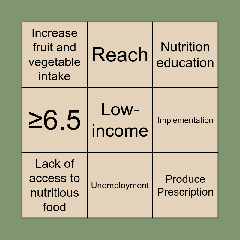 This bingo card has 12 words: Medically tailored meals, Produce Prescription, Lack of access to nutritious food, Low-income, Nutrition education, ≥6.5, Unemployment, Food is Medicine, Increase fruit and vegetable intake, Reach, Implementation and Culturally tailored.