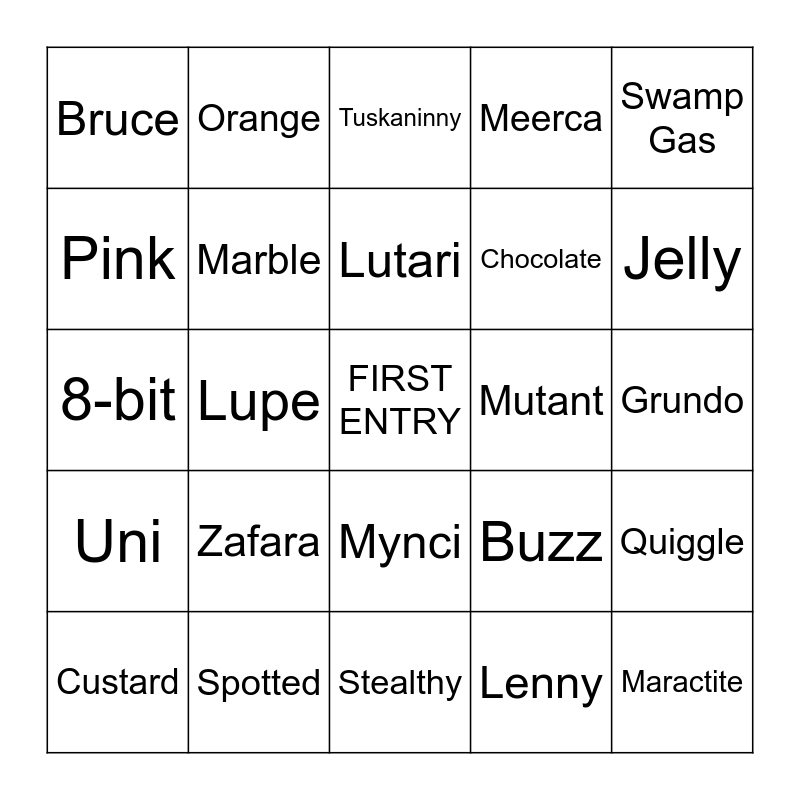 This bingo card has a free space and 24 words: Zafara, Spotted, Lutari, Custard, Swamp Gas, Bruce, Pink, Orange, Mutant, Mynci, Chocolate, 8-bit, Buzz, Quiggle, Marble, Lenny, Grundo, Tuskaninny, Jelly, Lupe, Maractite, Uni, Meerca and Stealthy.