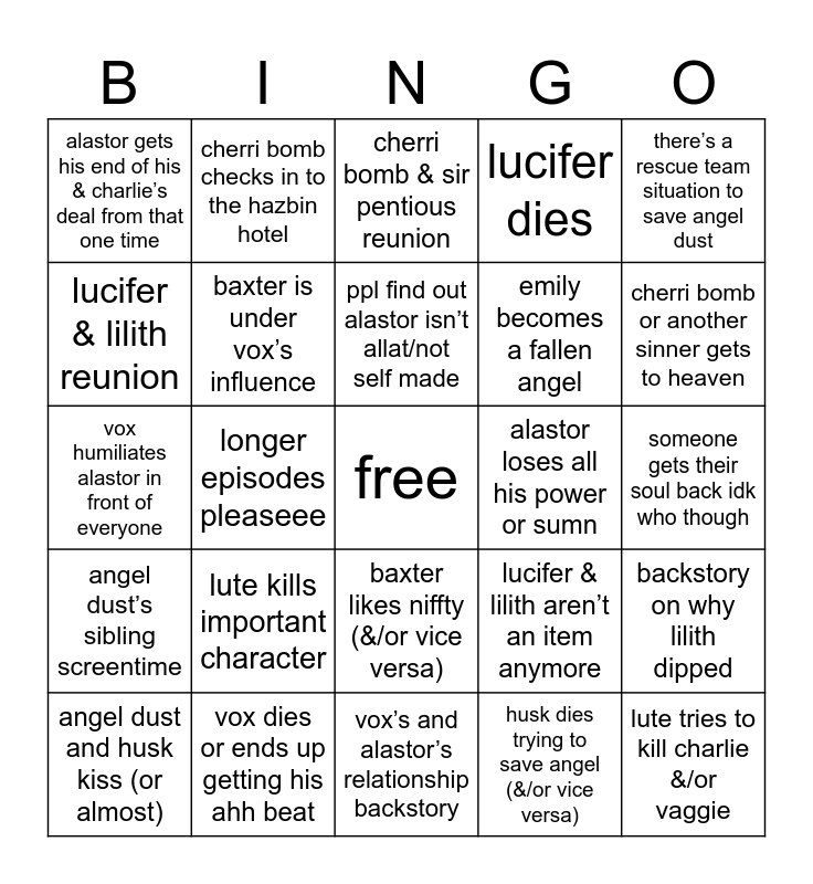 This bingo card has a free space and 24 words: lute kills important character, vox dies or ends up getting his ahh beat, ppl find out alastor isn’t allat/not self made, angel dust and husk kiss (or almost), there’s a rescue team situation to save angel dust, alastor gets his end of his & charlie’s deal from that one time, lucifer & lilith reunion, cherri bomb checks in to the hazbin hotel, alastor loses all his power or sumn, baxter likes niffty (&/or vice versa), emily becomes a fallen angel, vox humiliates alastor in front of everyone, lucifer & lilith aren’t an item anymore, backstory on why lilith dipped, baxter is under vox’s influence, husk dies trying to save angel (&/or vice versa), someone gets their soul back idk who though, cherri bomb & sir pentious reunion, cherri bomb or another sinner gets to heaven, longer episodes pleaseee, lute tries to kill charlie &/or vaggie, angel dust’s sibling screentime, lucifer dies and vox’s and alastor’s relationship backstory.