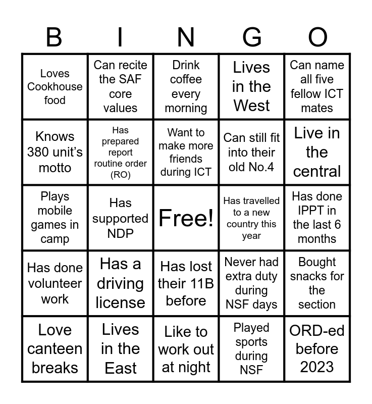 This bingo card has a free space and 43 words: Is learning something new this year, ORD-ed before 2023, I am still studying, Love canteen breaks, I am a working adult, Played sports during NSF, Drink coffee every morning, Made new friends from ICT, Can name all five fellow ICT mates, Lives in the East, Lives in the West, Has travelled to a new country this year, Has lost their 11B before, Has a driving license, Likes to sing karaoke, Like to work out at night, Live in the North-East, Plays mobile games in camp, Has an NS buddy still in contact, Live in the central, Can recite the SAF core values, Knows their NS enlistment date, Enjoys spicy food, Loves Cookhouse food, Has a nickname in camp, Has done IPPT in the last 6 months, Enjoys ICT more than work, Enjoys jogging or walking., Never had extra duty during NSF days, Has done volunteer work, Has a go-to drink from the canteen, Bought snacks for the section, Enjoys learning new things, Has supported NDP, Has a funny ICT memory to share, Changed PES status during NSF, Enjoys working in teams, Want to make more friends during ICT, Knows 380 unit’s motto, Can still fit into their old No.4, Has helped a soldier with ORD paperwork, Has prepared report routine order (RO) and Has generated NS unit nominal roll records.